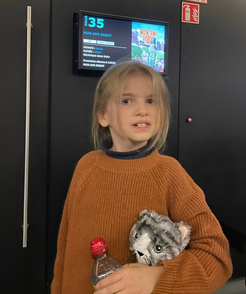 Gouttière le chat en peluche est venue avec moi au cinéma voir mon ami robot et le chien qui a une télévision avec un clown qui s’appelle Yoyo. C’est un chien qui fabrique un robot et il l’emmène a la plage et l’abandonne. Il ne peut plus le retrouver car la plage est fermée. C’est un film rigolo mais triste. ça finit bien.