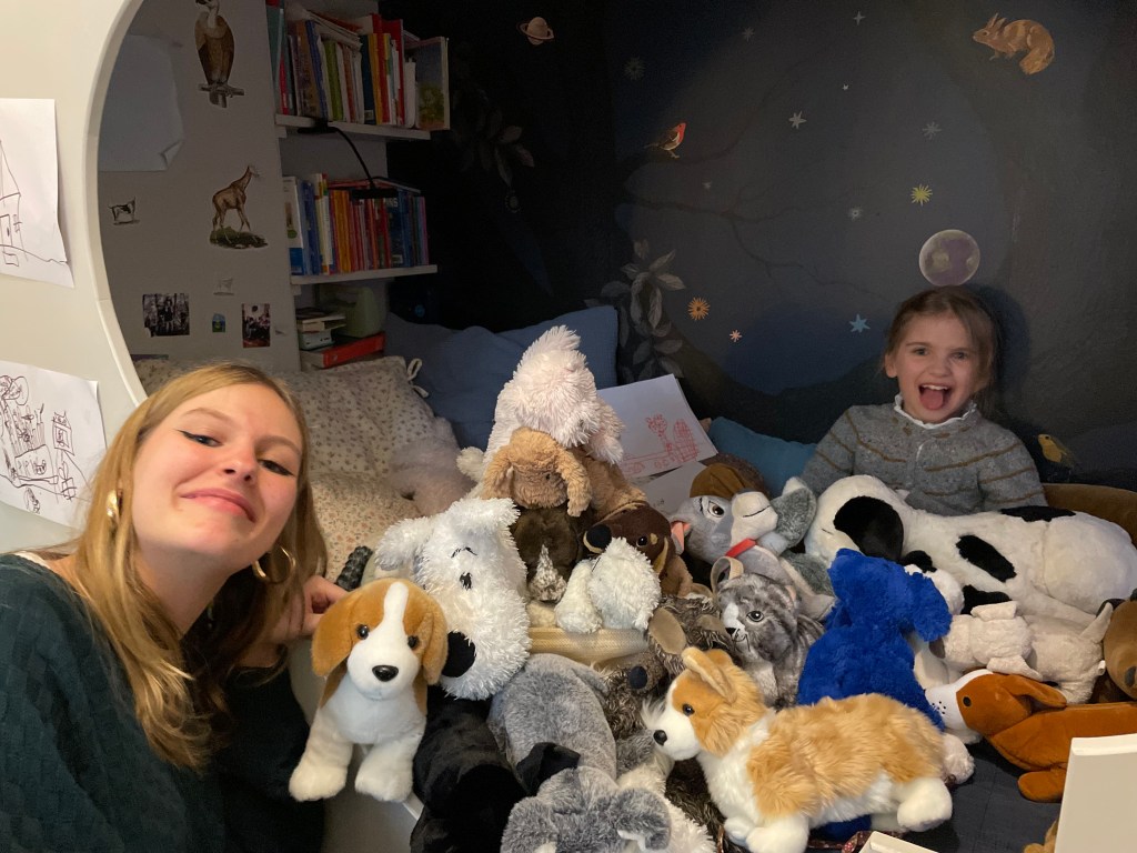 Je suis avec Alice et tous mes doudous qui jouent à se bagarrer dans leur copain qui n’existe plus. Alice est ma Babysitter. Elle fait la meilleure voix de Chaplapla.