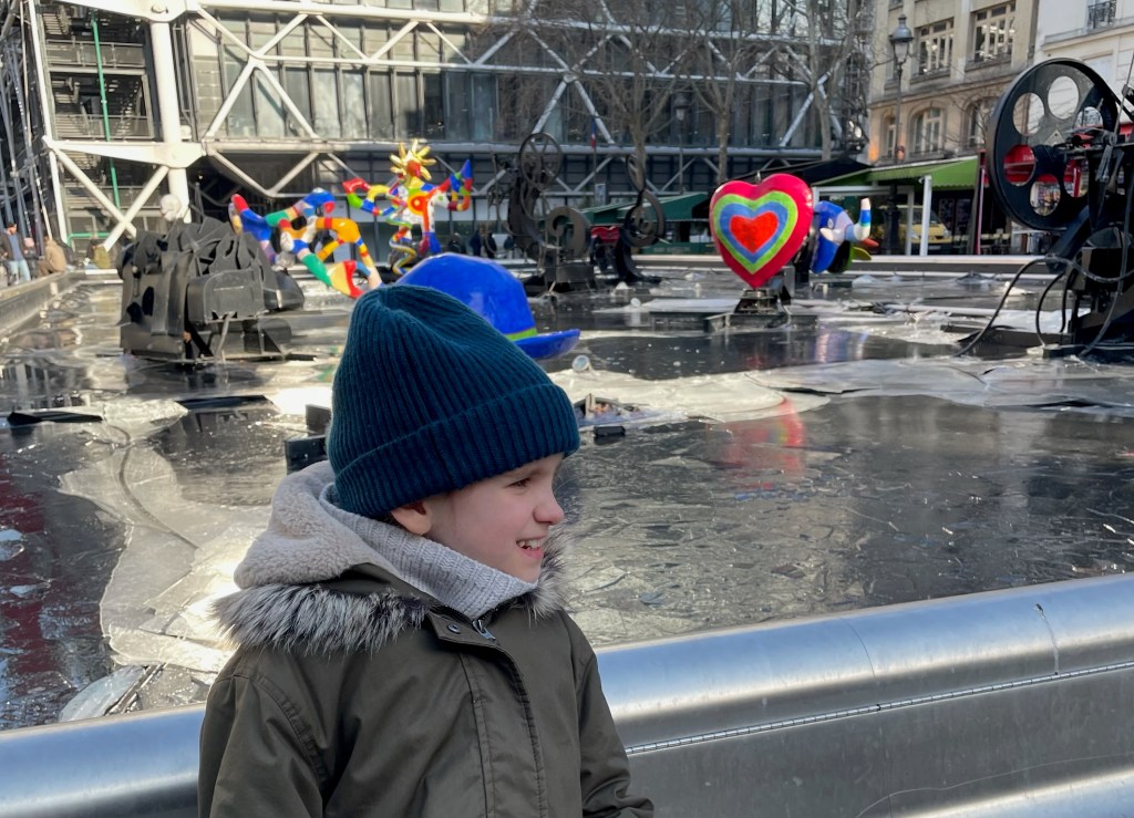 Je joue au patin à glace avec de la glace sur la patinoire de la fontaine Stravinsky pour mon husky.
