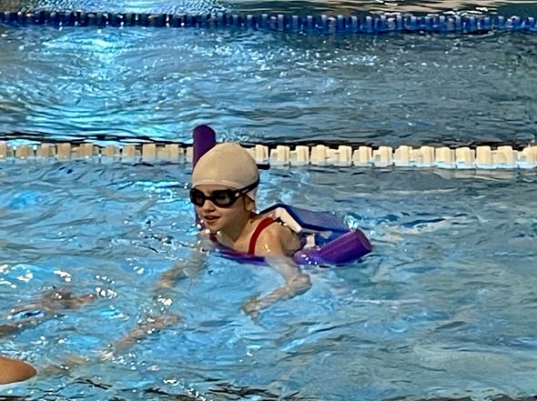 Je neige dans la piscine avec Inoa qui me noie ! Pour neiger la brasse, il faut faire le crayon, la grenouille, les ciseaux et la chaussette.