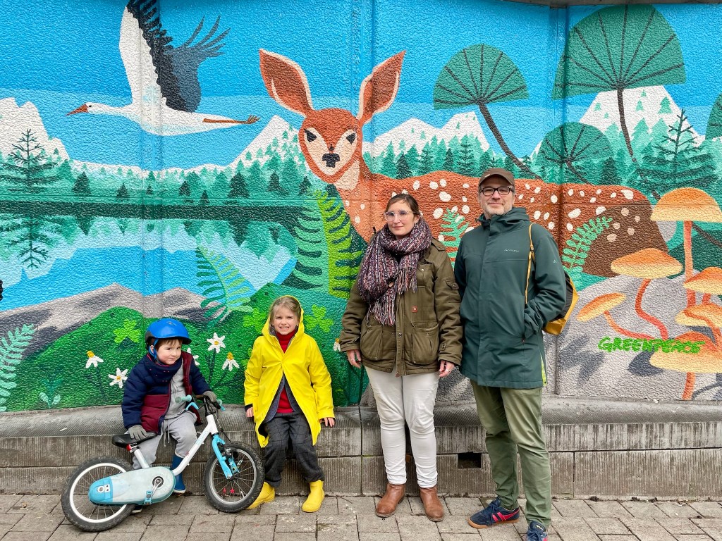 Avec Isaac, mon oncle et ma tante, je suis devant une fresque avec une cigogne et Constance Biche !