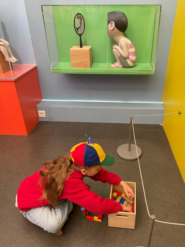 Je suis au musée en herbe avec des blocs. Je construis un château. Un chat arrive pour kidnapper un perroquet.