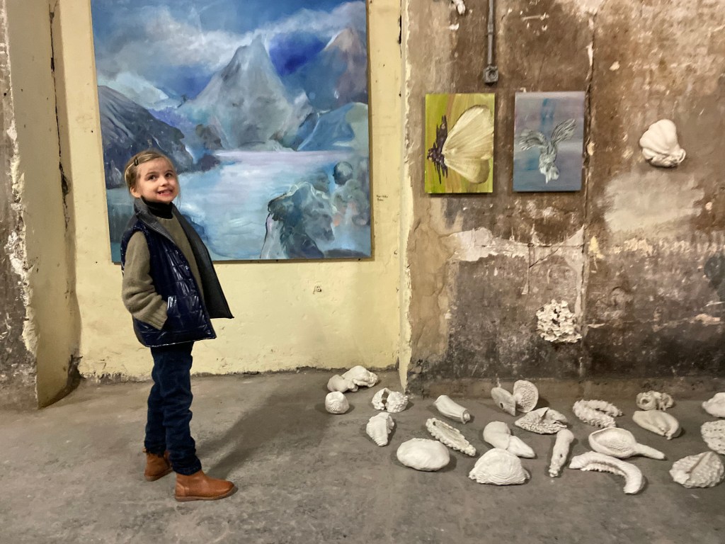 Je suis à une exposition dans le garage des plombiers. Il y a plein de coquillages.