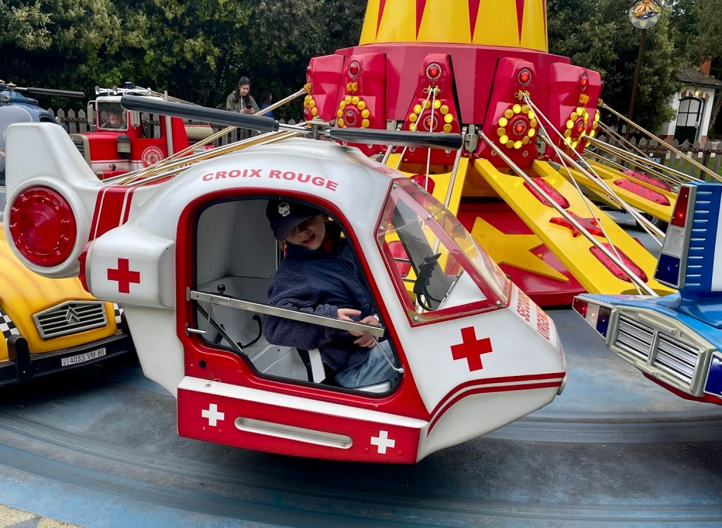 Je suis dans le manège Toupie et je suis dans l’hélicoptère Croix Rouge. Cet hélicoptère vole quand j’appuie sur le bouton et fait le bruit de l’alerte intrusion.