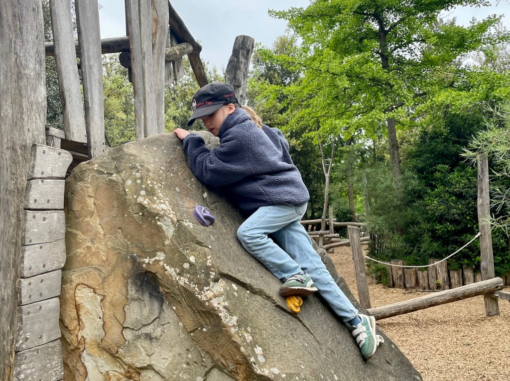 Je grimpe sur un mur d’escalade en rocher pour aller sur le toboggan avec la glisse. Je suis la reine de la glisse du toboggan qui saute partout !