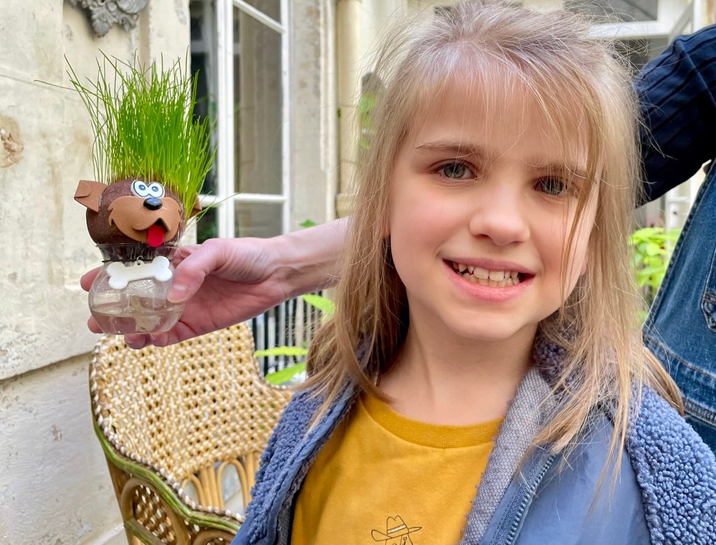 Je suis à côté d’un chien avec des cheveux en herbe qui ont si bien poussé que le chien va avoir les cheveux looooooooooongs, si loooooooooooongs qu’il va se les prendre dans les yeux !