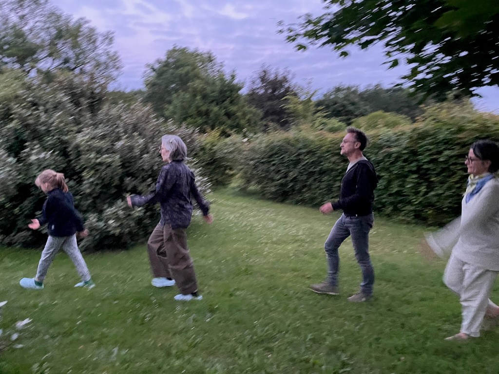 Je joue à « copiez le chien » avec Séverine, Jean-Christophe et maman. Tout ce que je fais les autres doivent faire pareil parce que je suis le chien.