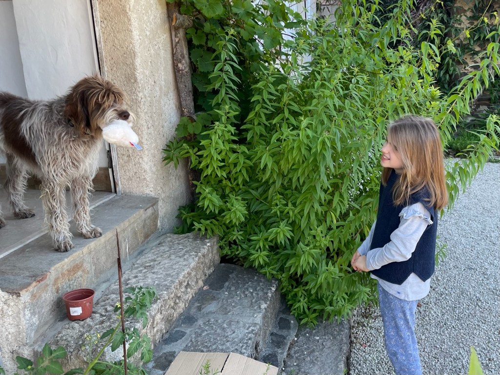 J’ai offert un os en peluche à la chienne Sweety. Elle était contente mais 2 jours plus tard elle l’avait tout déchiqueté.