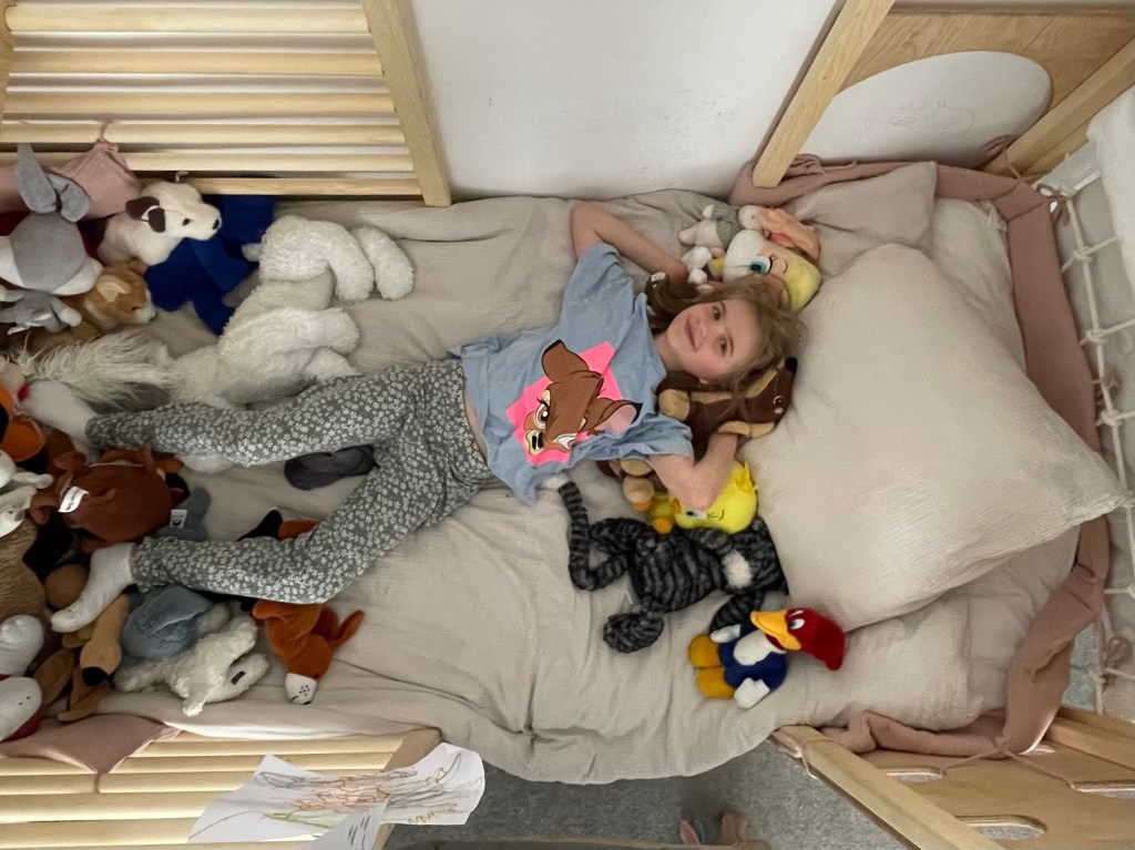 Bien sûr il y a parfois des imprévus, une visite, une activité peinture en extérieur, mais rien qui dure plus d’une heure, et elle résiste avec véhémence au moindre chamboulement de son emploi du temps… « Les feuilles ne vivent que dans le bureau, je ne peux pas dessiner dans la cuisine. Les questions c’est dans la maison, pas dehors ! Je me suis réveillée casanière ce matin ! Demain je serai aventurière. » À noter aussi, l’heure d’iPad post repas est consacrée au visionnage de slime et autre gonflage de ballons à eau, mais le reste de ses 4 à 5 heures d’écran se passe plutôt à écrire, dessiner et traduire dans des langues rares. Il y a aussi des nouveautés, comme le jeu consistant à donner chacun son tour des prénoms aux 1000 peluches du catalogue Jellycat qui nous a occupés joyeusement des heures durant, le grand écran avec Disney+, sur lequel elle n’accepte que Winnie l’Ourson avec sous-titres en français canadien. Et puis au milieu de tout ça il y a toujours les questions, et les descriptions de dessins, moments de complicité, à ses conditions.
