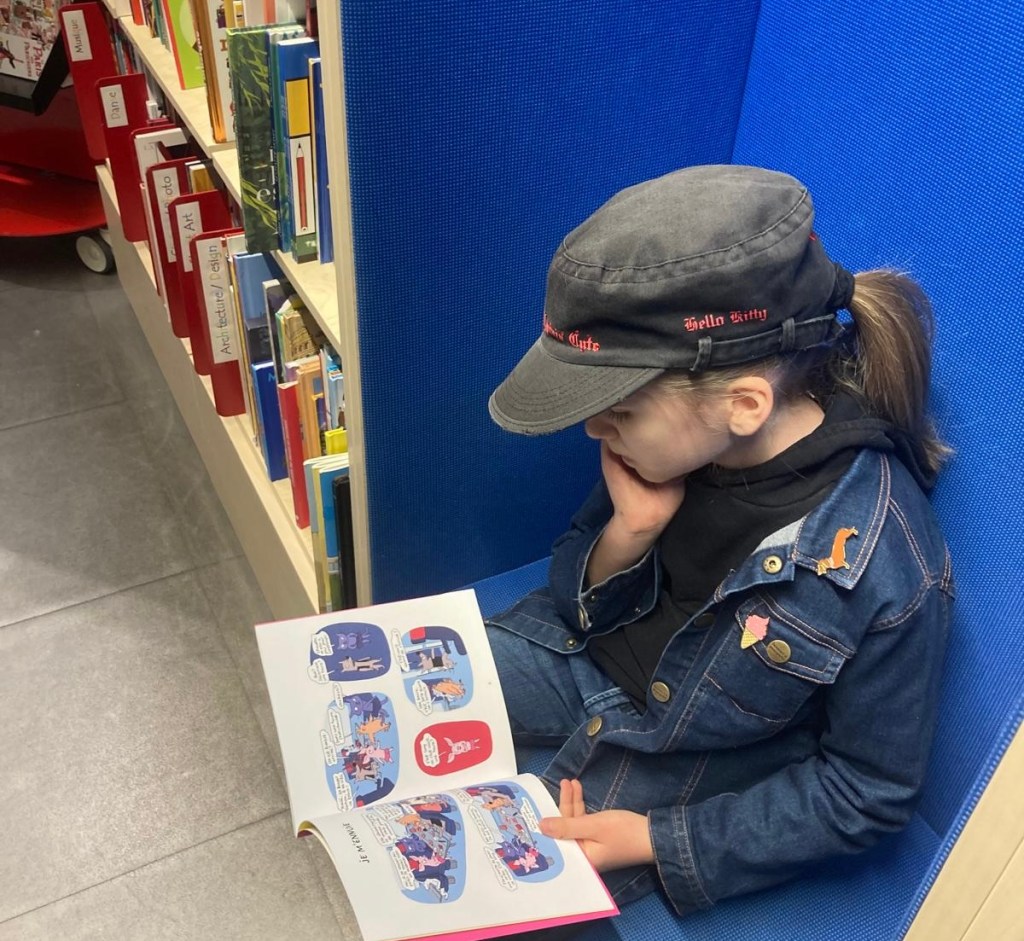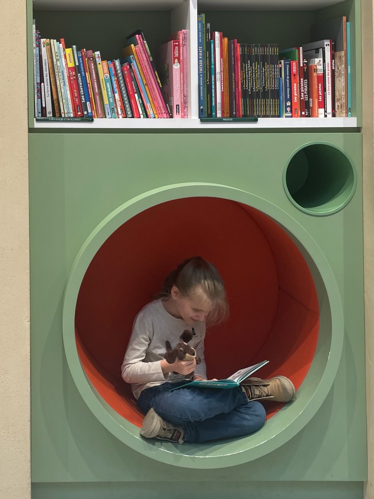 Je suis allée à Chantelivre. Moi et Barzok, petite peluche de teckel, lisons un p’tit loup dans un fauteuil en forme de trou.