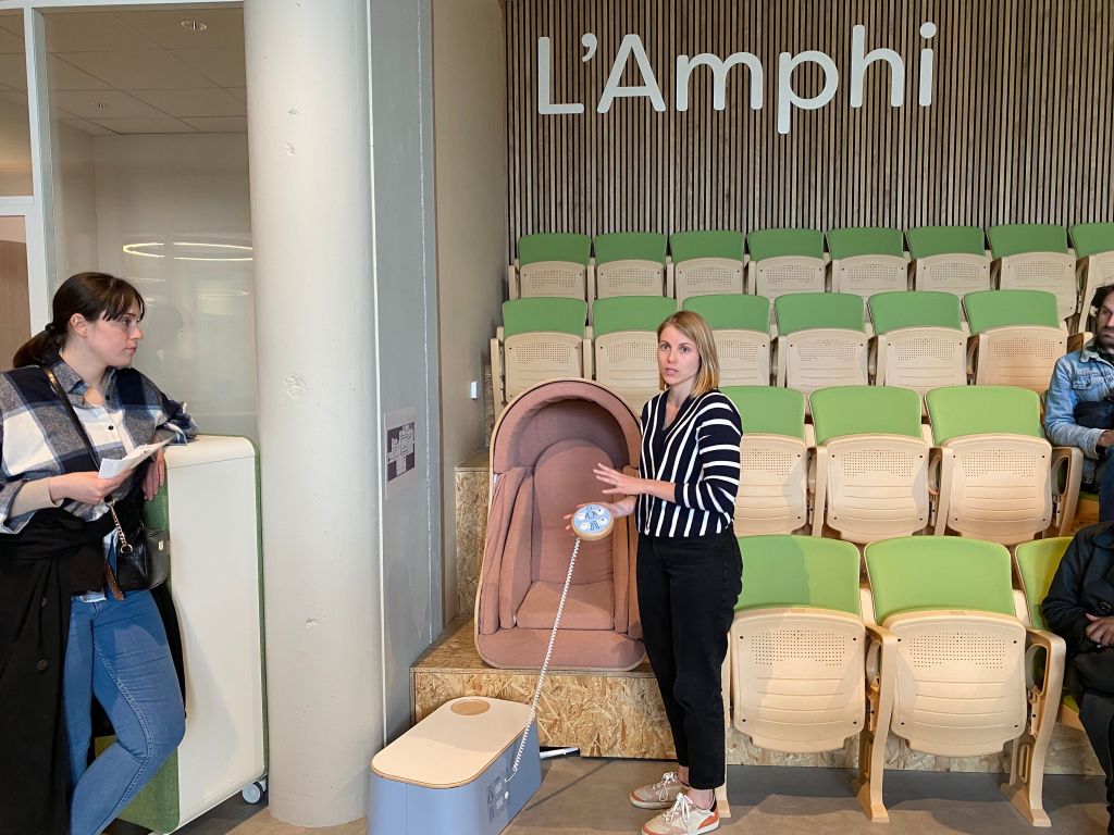 L’endroit est chaleureux et a été pensé pour les autistes ! Des espaces de travail, de jeu, des tables accueillantes, pour discuter ou prendre un café, comme enveloppées dans un « cocon » pour certaines avec une luminosité plus douce. Tout au fond, se trouve le petit amphithéâtre dans lequel quelques fauteuils OTO de serrage sont installés… Allez les essayer !