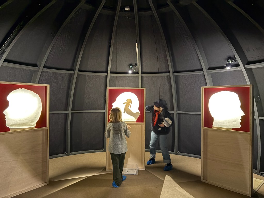 Dans la galerie des enfants, il y a des têtes théâtres où des ombres de chiens en peluches font des spectacles.