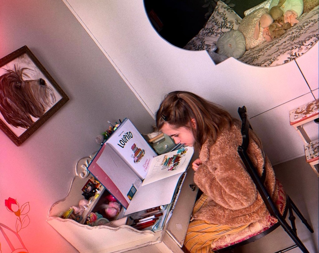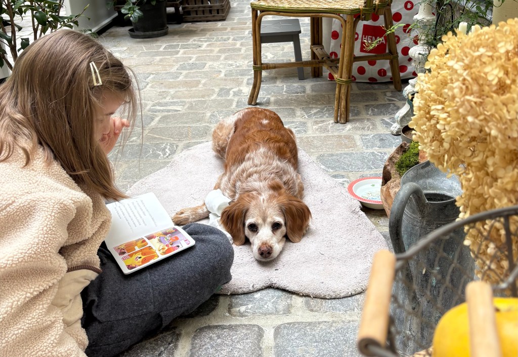 Voilà Lisa, la chienne de Maria-Christina qui est en train d’écouter une histoire que je lui lis. Lisa est vraiment très belle. C’est un chien un petit peu sale avec des poils mouillés partout mais je l’aime quand même.