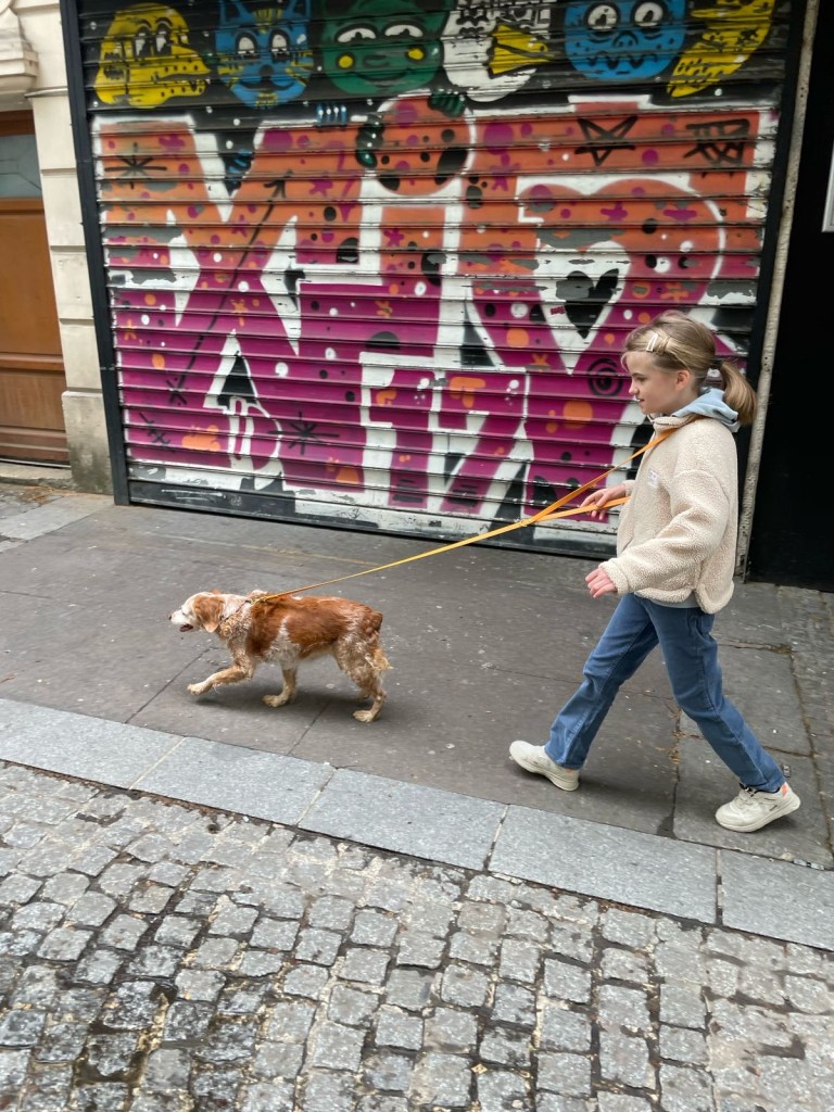 Pendant les vacances, j’ai aussi promené la chienne Lisa en laisse. On est allées dans une animalerie pour lui acheter des jouets et des friandises, et aussi un os à moelle.
