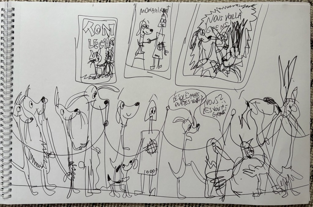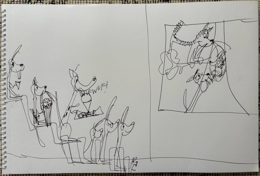 C’est une machine à popcorn géante que regarde un chat. Un lapin achète une glace à la carotte et un chien rêve d’une glace à l’os.