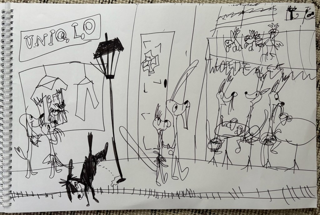 Ce sont un chat et un lapin qui partent voit « Tom le chat ». Dans cette rue, on voit aussi trois chats courronnés en train de manger dans un restaurant, un chien qui fait pipi sur un réverbère, et un autre chien et un chat courronné qui regardent un ticheurte avec eux dessus.