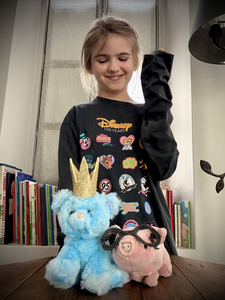 Pour l’anniversaire de Dad, je lui ai offert une Porcinette : un cochon avec des lunettes à l’effigie d’un personnage du film « nous voilà grands ». Pour le faire on a pris un vieux cochon Jellycat et on lui a cousu des lunettes. Dad a trouvé ça trop bien !