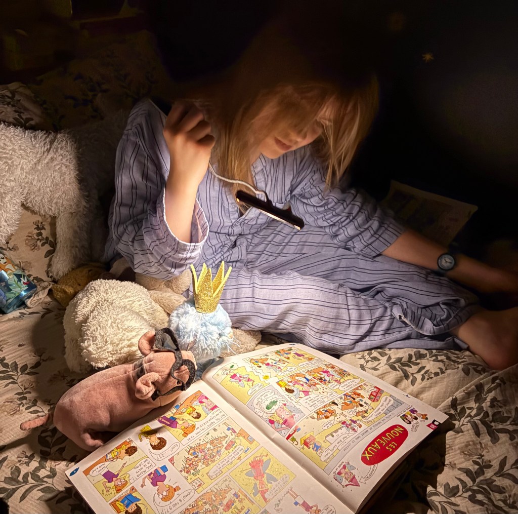 Ceci est la photo que je vais envoyer à Astrapi. Une photo de Petite Bleue et Porcinette en train de lire Astrapi.